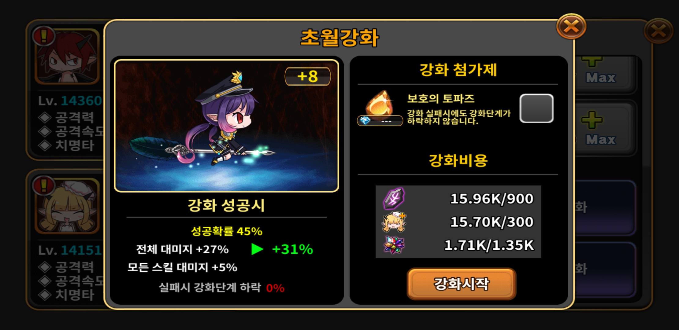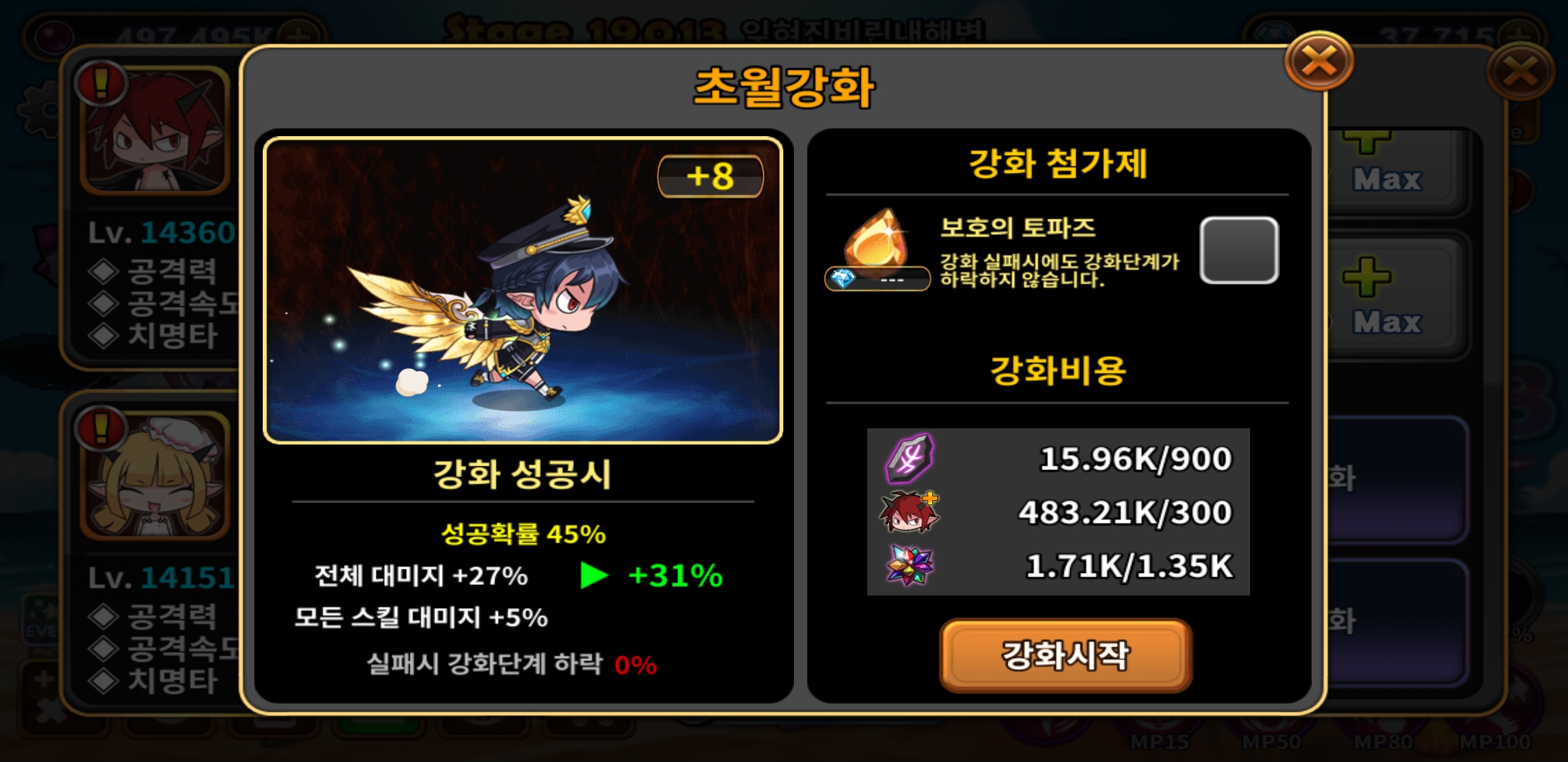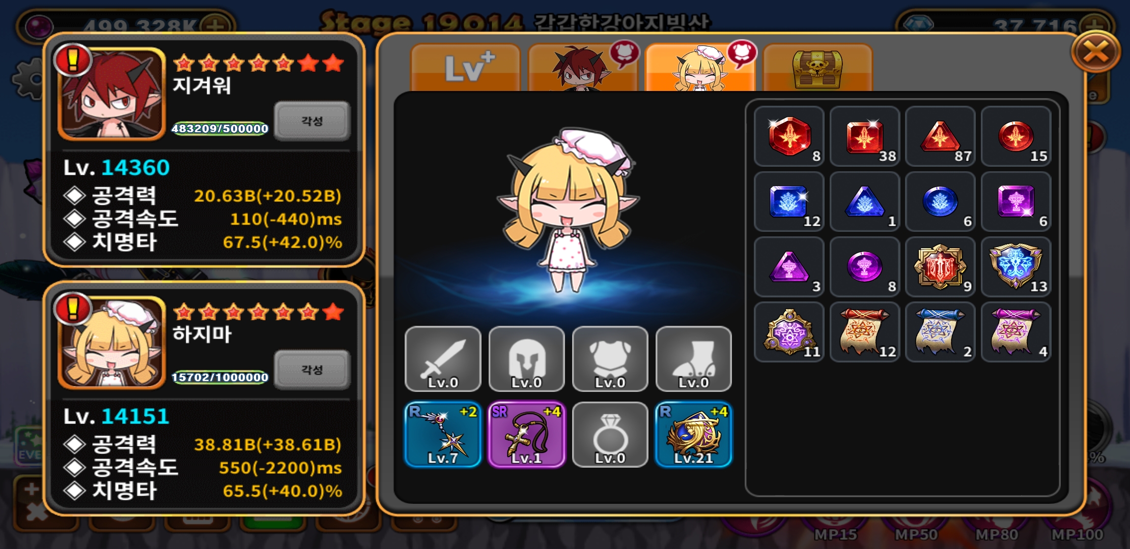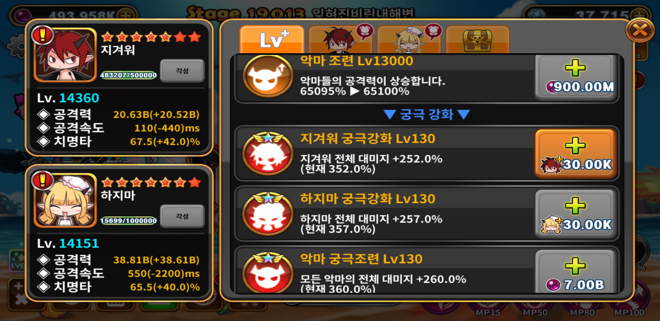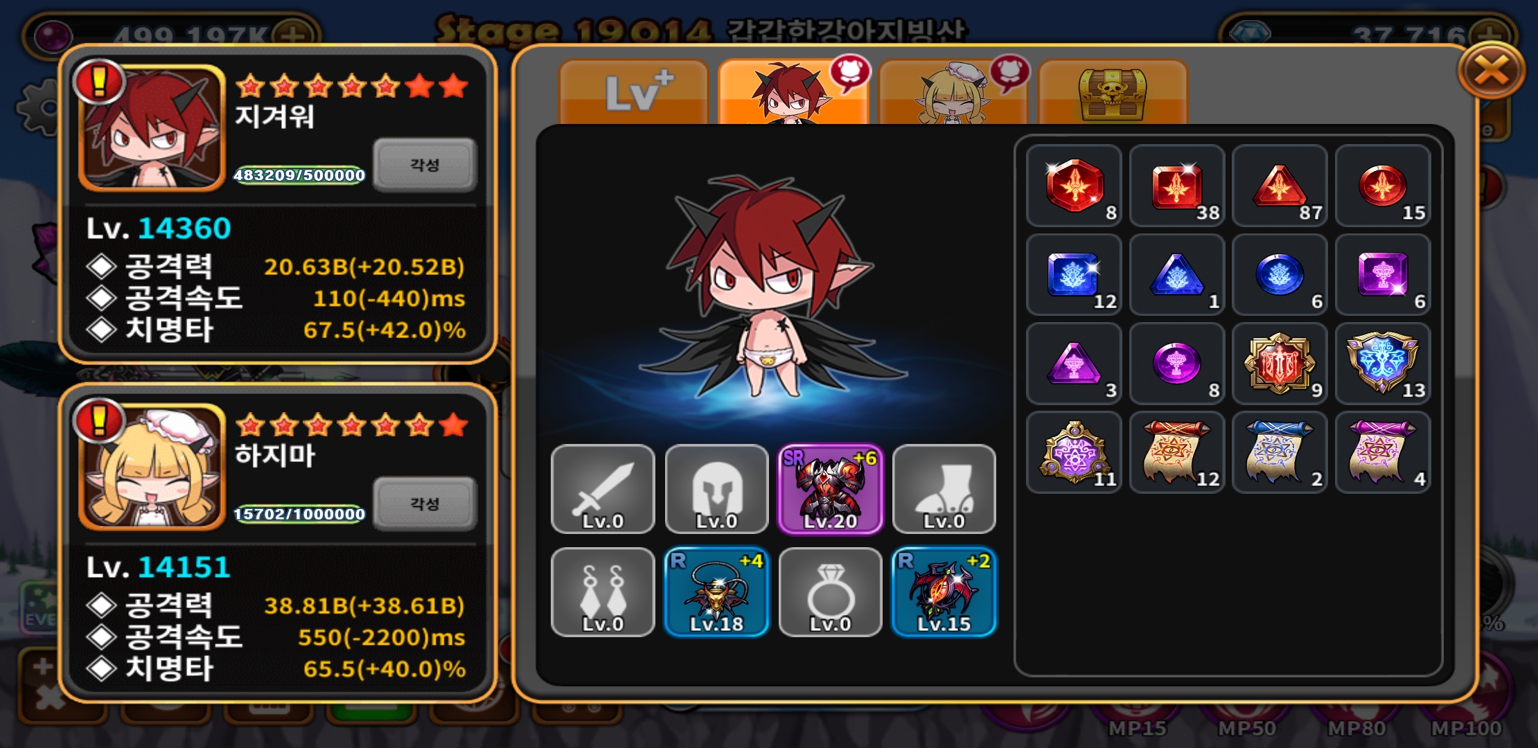 하지마 Lv.14151 공격력 : 38.81B(+38.61B), 공격속도 : 550(-2200)ms, 치명타 : 65.5(+40.0)%