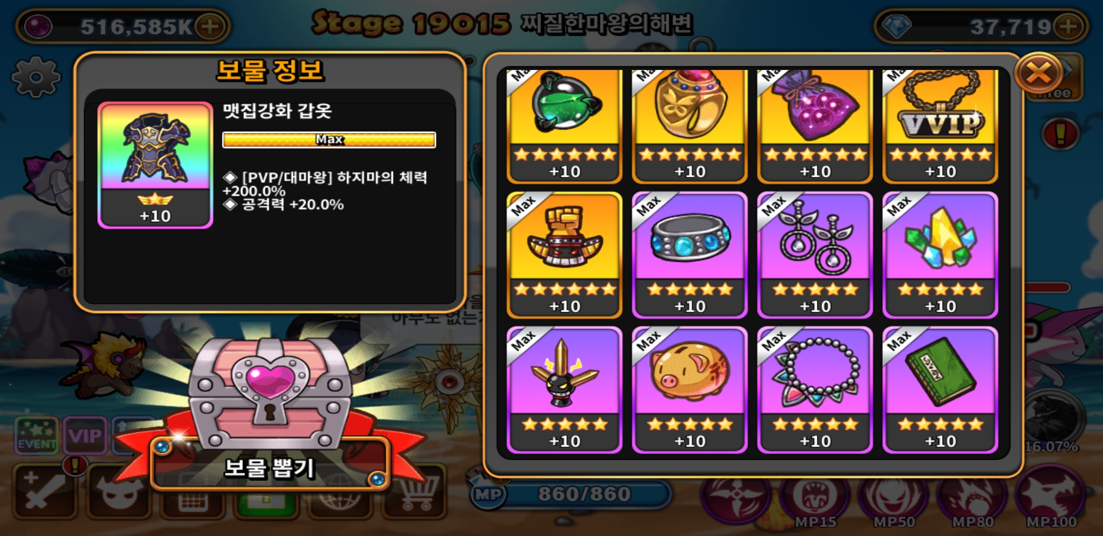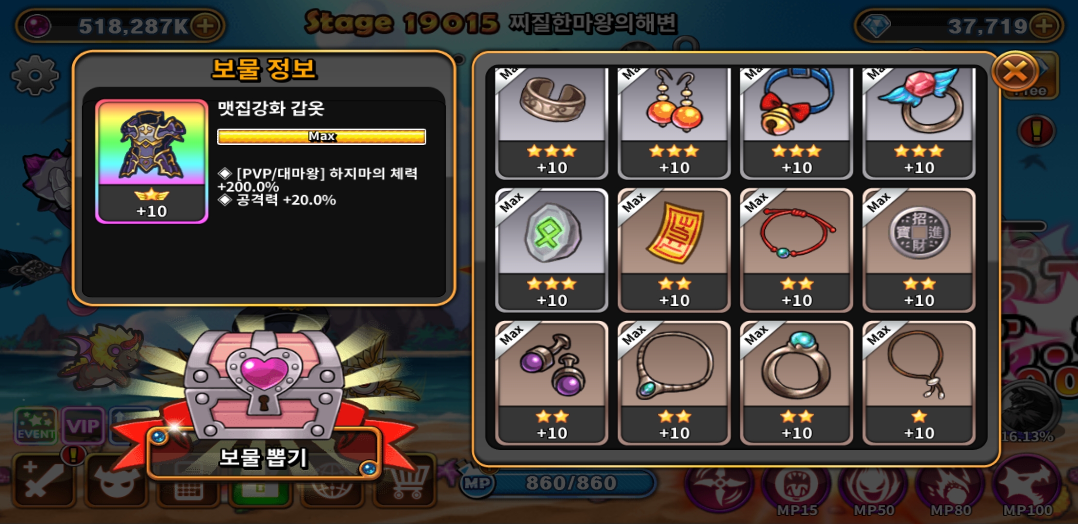 [보물] 마왕의 패기 +9, 악마왕 +9, 패션왕 +9, 영혼수집가의 팔찌 +9, 마지은의 수첩 +8 이하 미획득 보물 외 +10