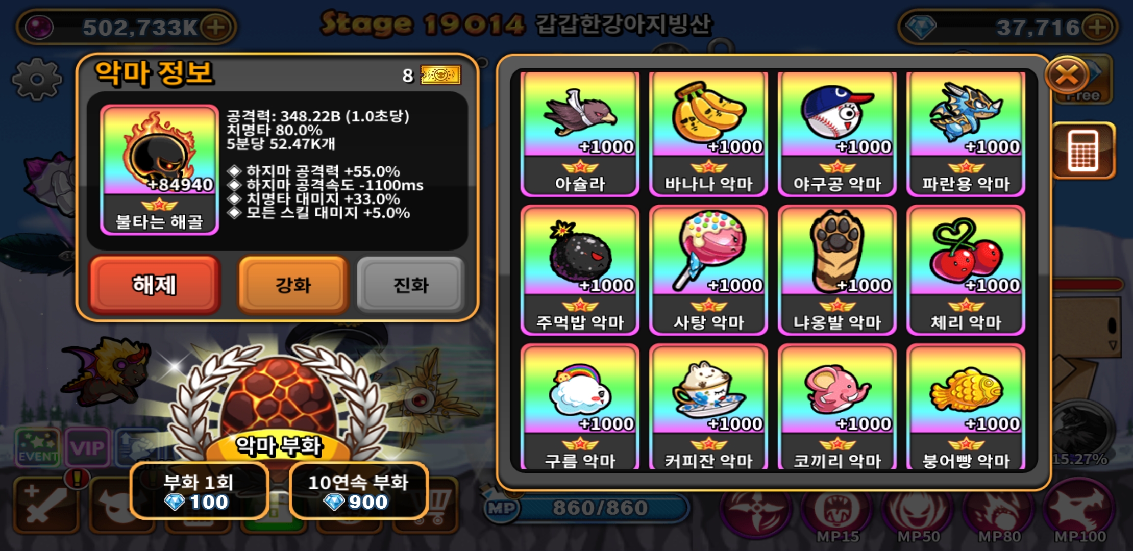 [악마] 불타는 해골 +84940, 루비 골렘 +22900, 저승이 +2000, 키메라 악마 +920, 사념체 악마 +3684, 초록용 악마 +2000, 아기천사 +1730, 산삼악마 +1500, 빨간용 악마 +1500, 슬리퍼 악마 +1500, 이하 잡악마 모두 +1000