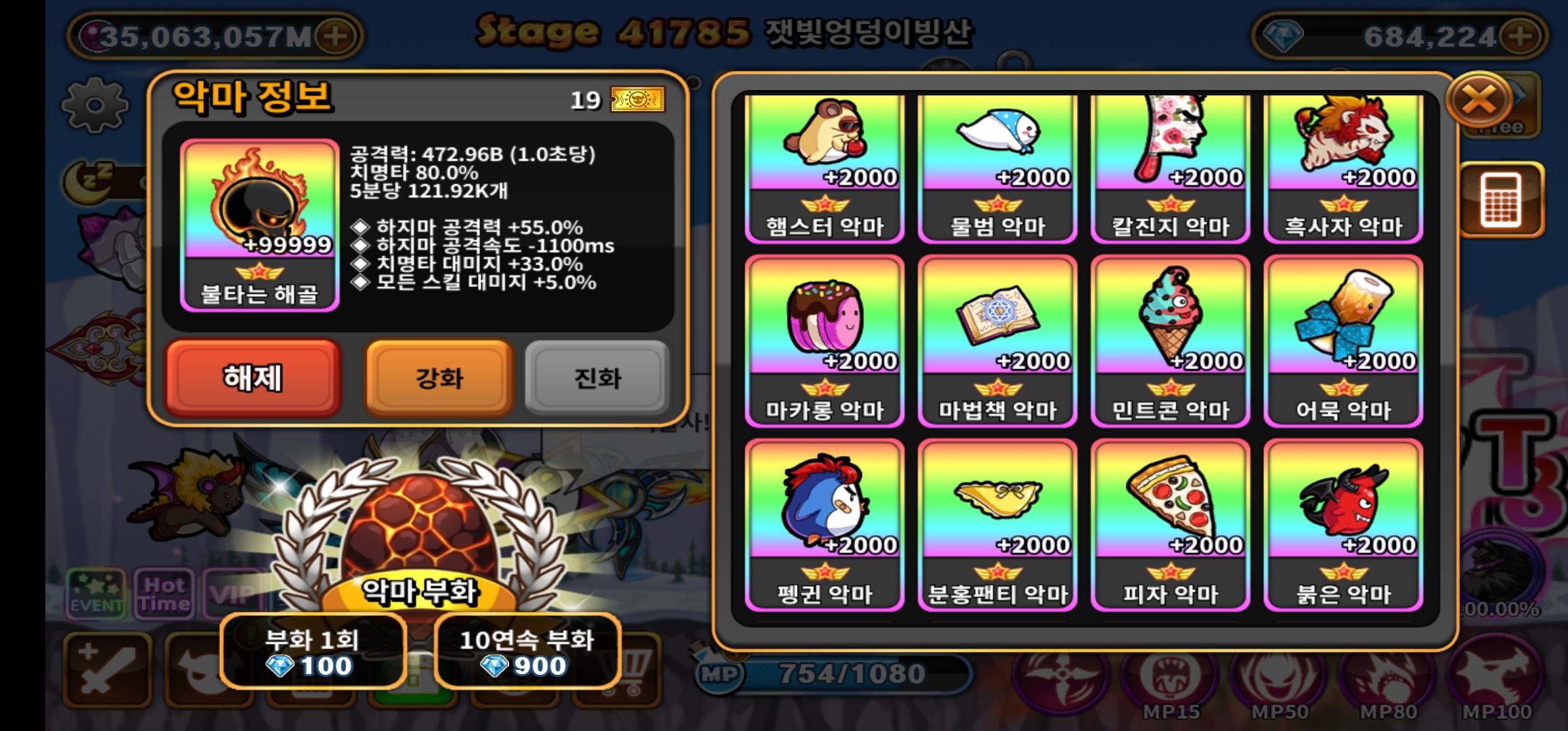 [악마] 불타는 해골 +99999, 루비 골렘 +99999, 저승이 +10190, 키메라 악마 +2870, 사념체 악마 +6066, 초록용 악마 +64720, 산삼 악마 +25000, 빨간용 악마 +6000, 아기천사 + 3690 이하 잡악마 모두 +2000