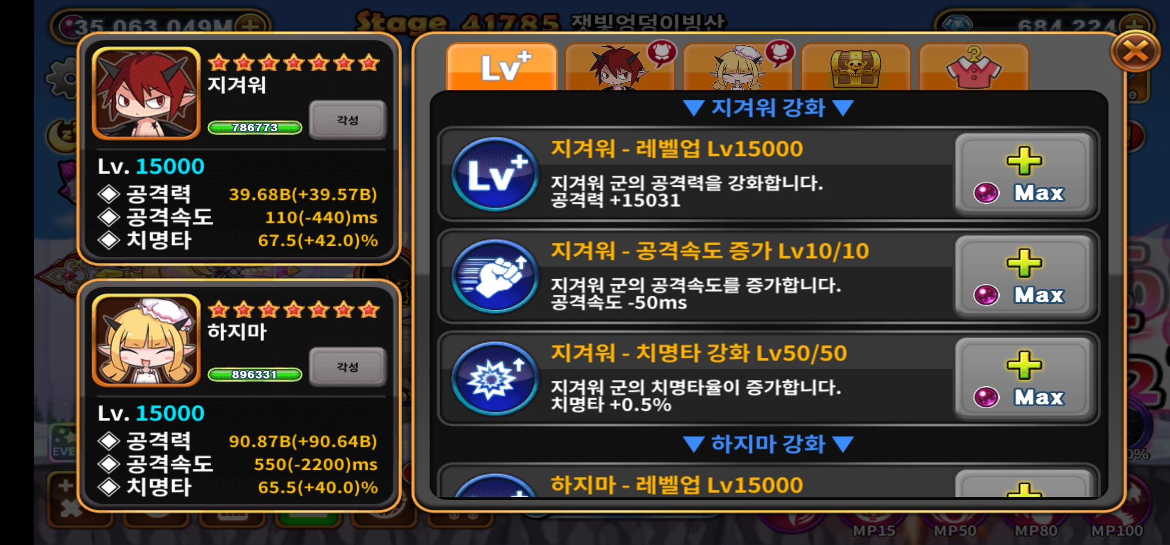 하지마 Lv.15000 공격력 : 90.87B(+90.64B), 공격속도 : 550(-2200)ms, 치명타 : 65.5(+40.0)%