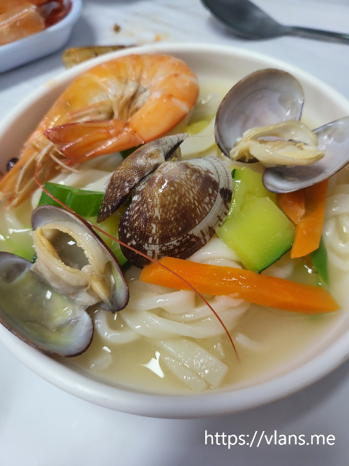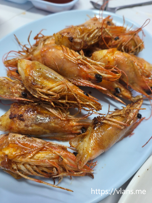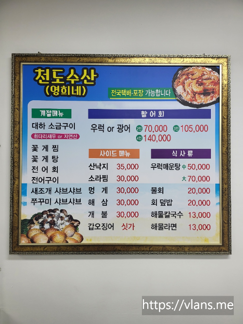 새우 2kg, 전어구이 반접시, 해물칼국수 2개,
