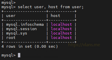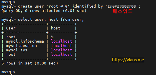 4. 접속할 계정생성 및 접속 호스트 설정(% : 모든 호스트, localhost : 로컬호스트, 특정 IP 설정 가능)