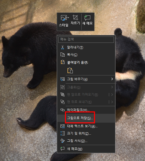 원본 이미지를 파워포인트에 넣고 "상단 메뉴 → 그림 서식"